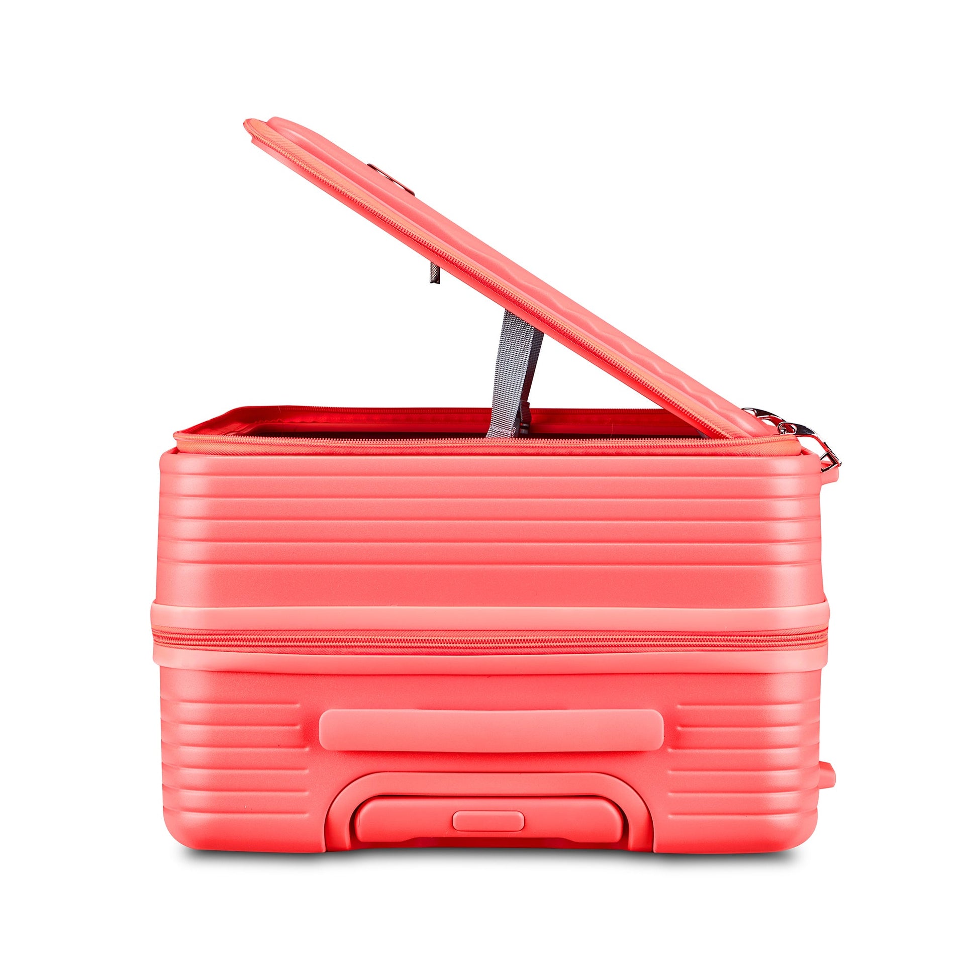 - 4 DOUBLE 360-DEGREE SPINNER WHEELS and sturdy ergonomic aluminum telescoping handle for effortless mobility.