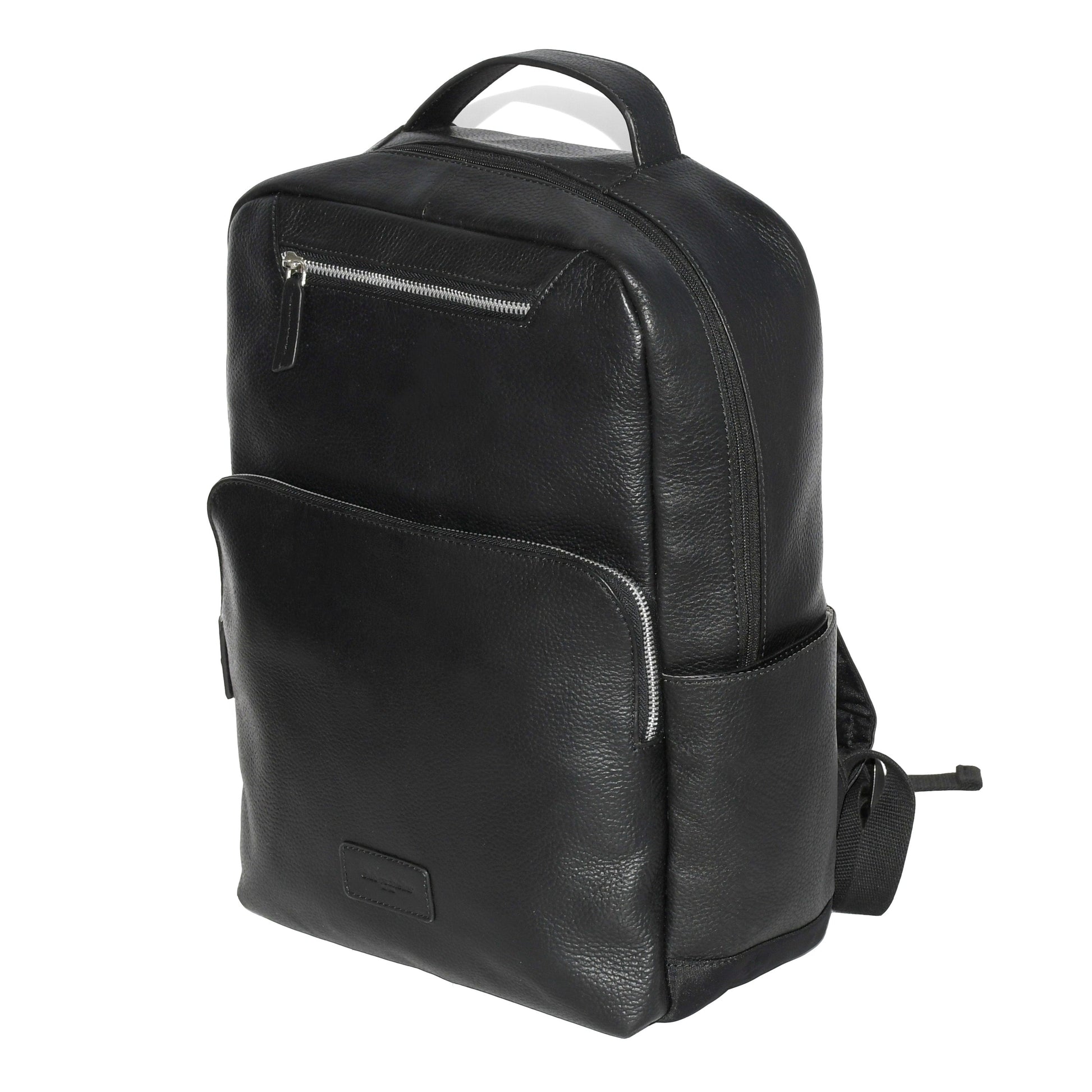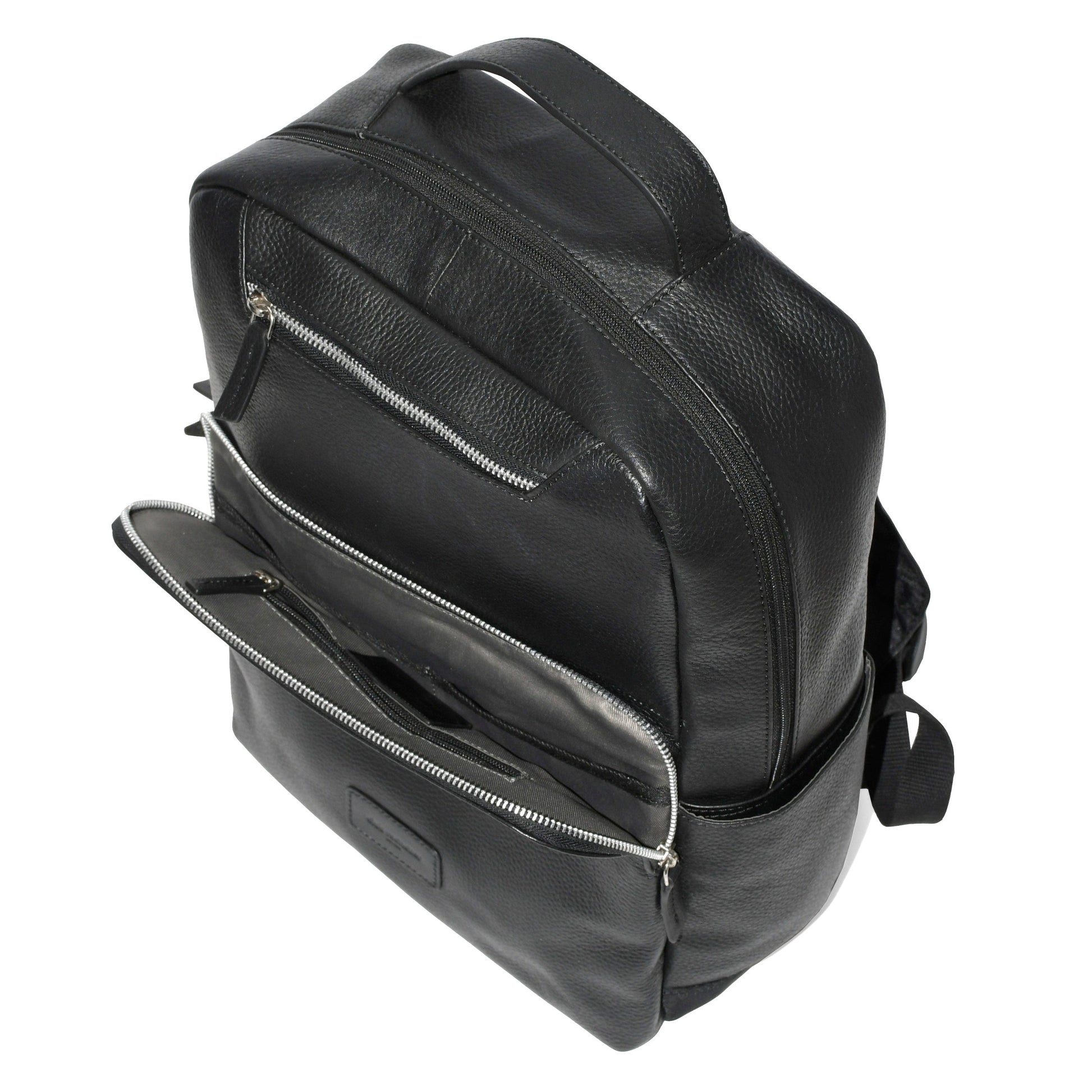 This convenient and practical, large capacity, leather backpack from Club Rochelier meets all your business and travel needs. Fabricated in Genuine textured leather and boasts a large interior compartment,padded laptop and Ipad compartment, Accessories pockets and an interior zipper pocket. This bag is also the perfect travel buddy with a backside travel-buddy strap that attaches to the telescopic handle of most luggage. Adjustable, padded backpack straps allows for extra comfort.