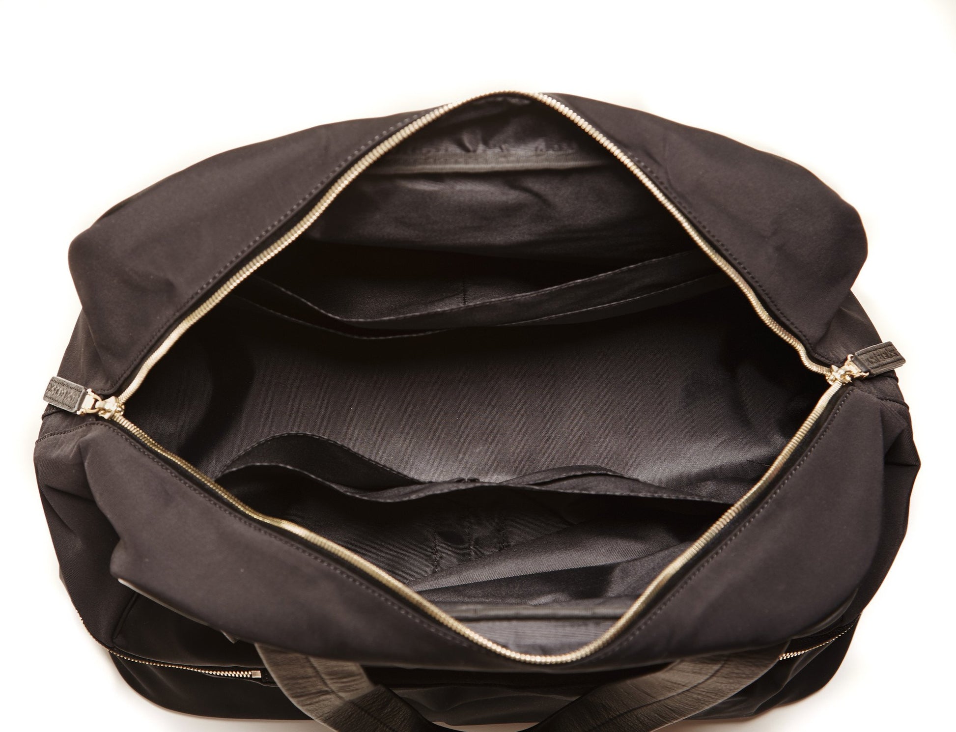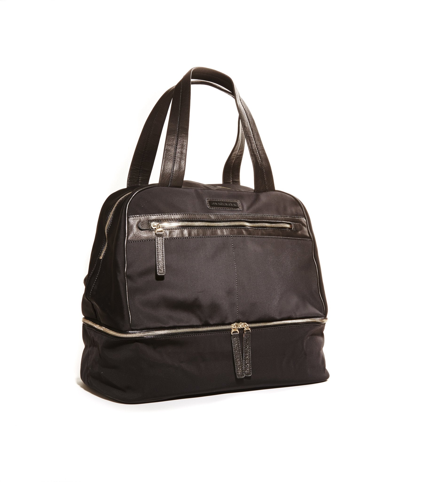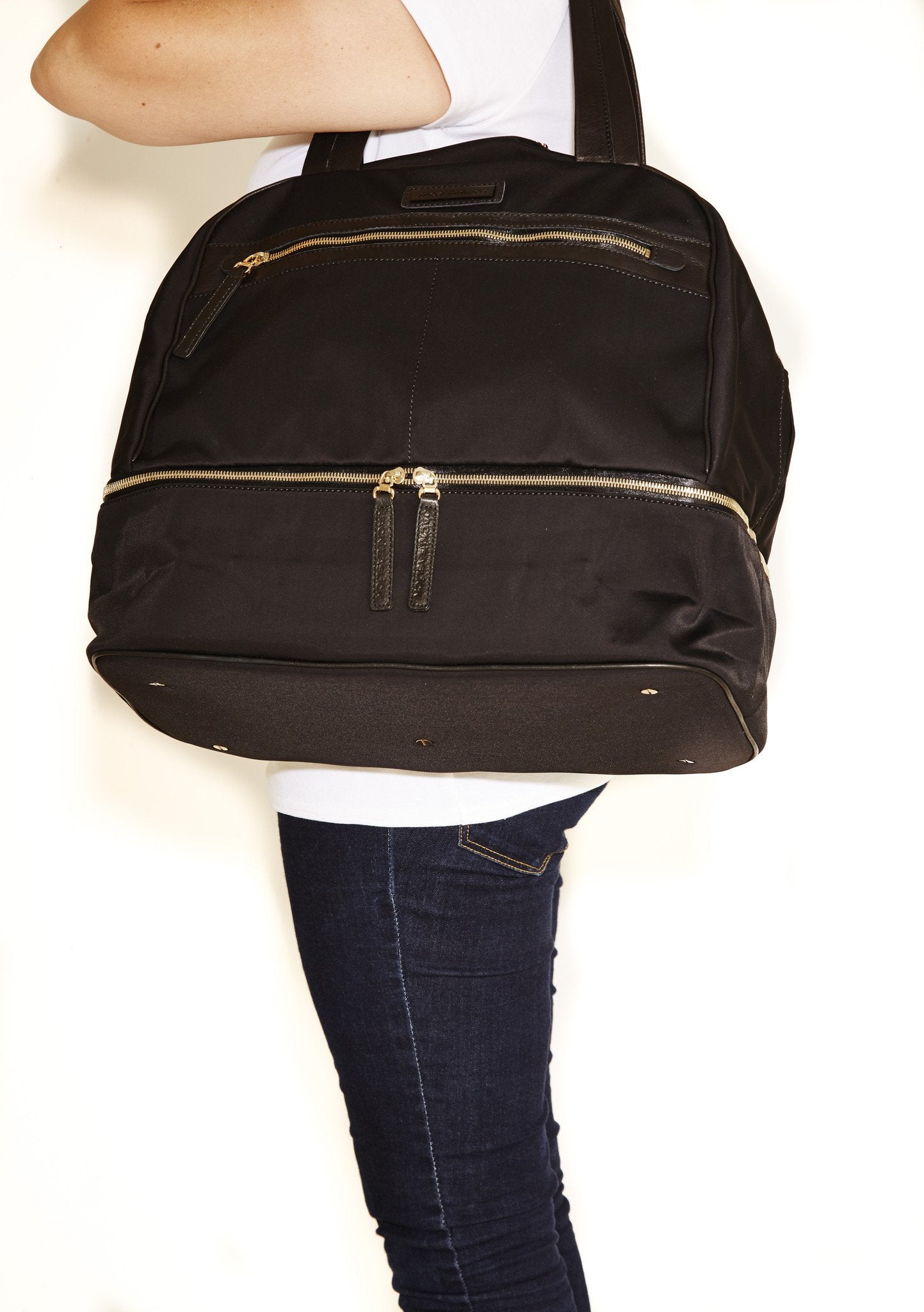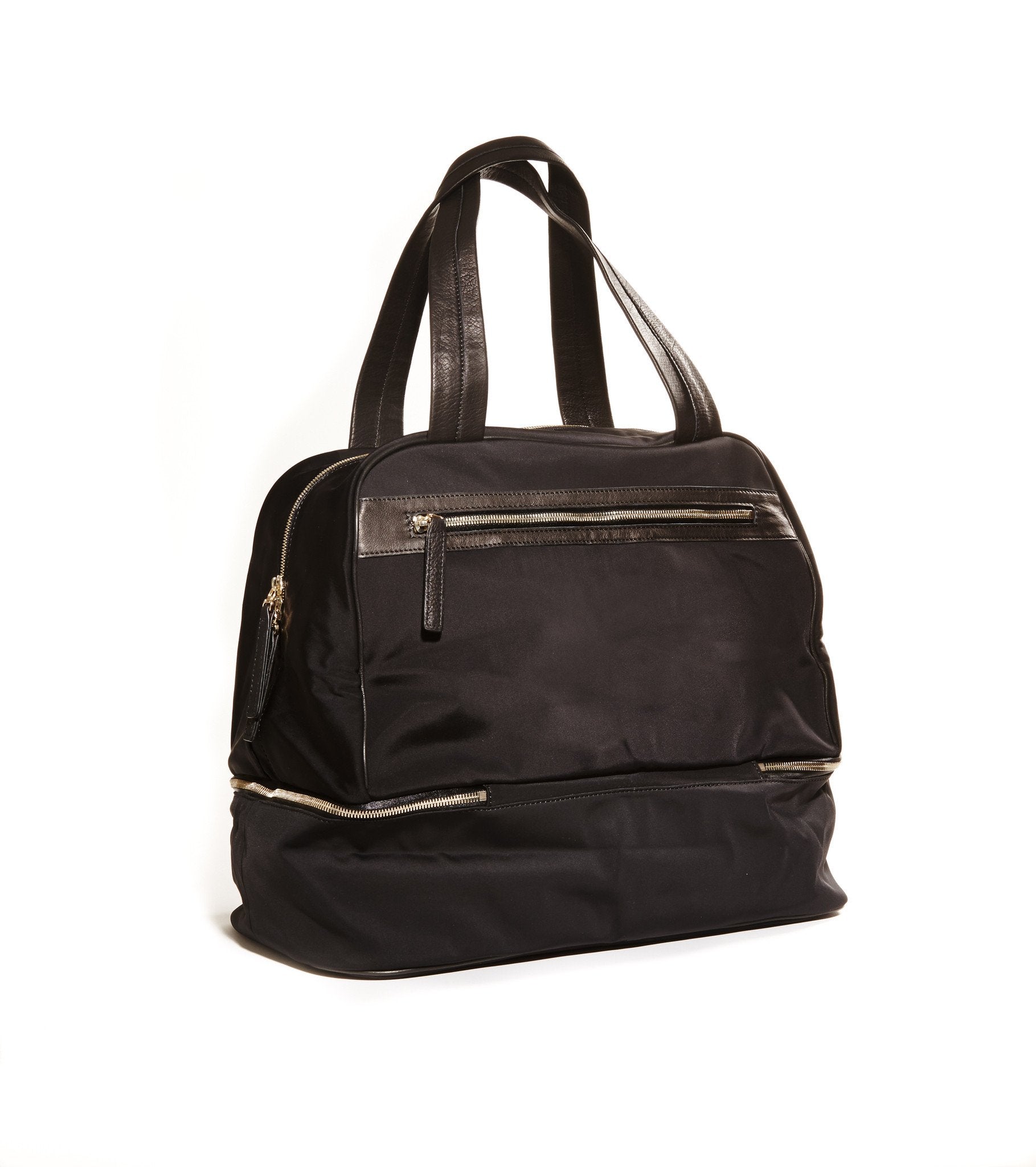 Black nylon travel bag with cowhide leather trim and nylon waterproof material. Smart and edgy with a Manhattan look.