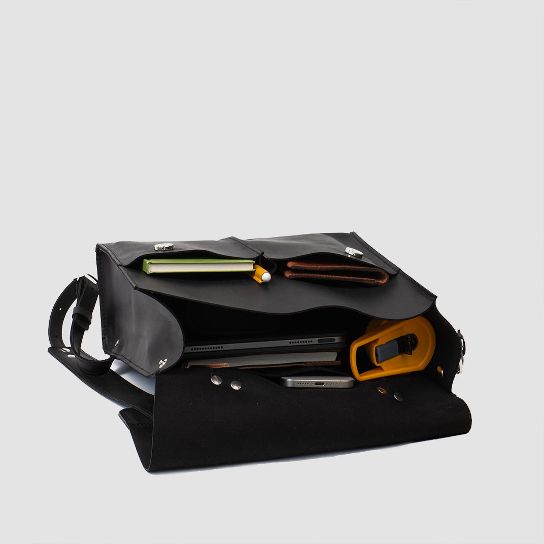• Hand strap and adjustable shoulder straps reinforced with a double layer of leather, ensuring comfort and durability to hold the necessary weight